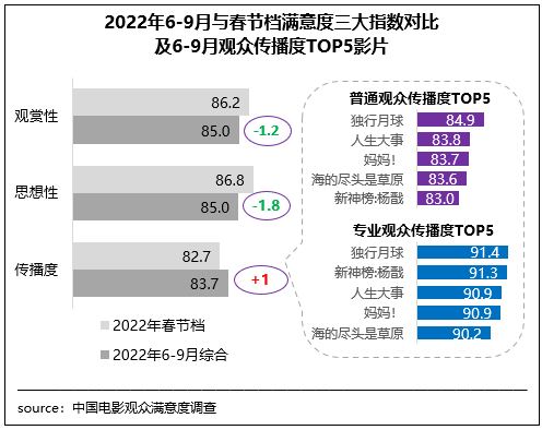 从影片来看,不同层次观众传播度前五的影片保持一致,其中档期观赏性居第一位的《独行月球》和思想性居第一位的《人生大事》得到了观众的积极推荐,传播度均居普通观众、专业观众评价的前三位;另外,与大众情感高度共鸣的《妈妈!》在普通观众中的传播度居第三位,视觉美学创作突出的《新神榜:杨戬》在专业观众中的传播度居第二位。