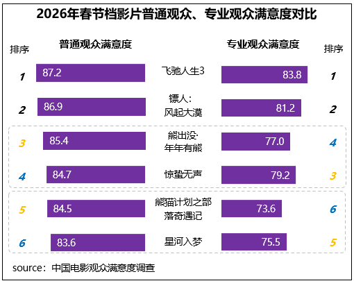 中国电影观众满意度调查・2026年春节档调查结果显示,春节档满意度稳中小幅提升至86.0分,近三年呈持续增长趋势。档期经典IP与创新作品齐聚,喜剧、武侠、科幻、动画、剧情等多元类型同期绽放。调查的六部影片中,《飞驰人生3》和《镖人:风起大漠》以超86分的满意度领衔,其余四部均超83分。