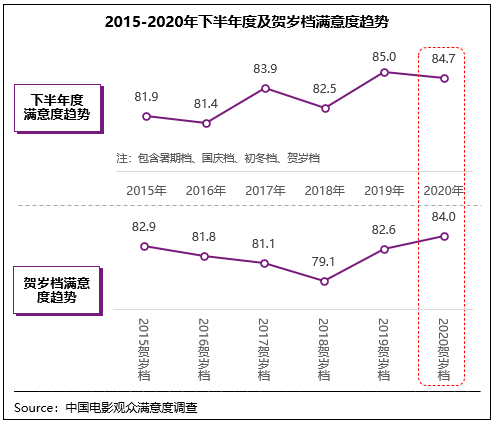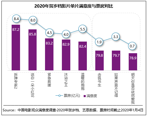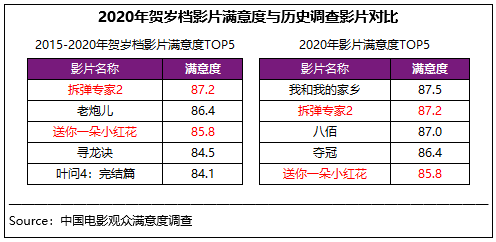 中国电影观众满意度调查∙2020年贺岁档调查结果显示,贺岁档满意度84.0分,较去年同期提升了1.4分,刷新同档期满意度纪录,《拆弹专家2》、《送你一朵小红花》分别以87.2分、85.8分居档期单片满意度前两位。至此,2020年中国电影观众满意度调查收官,在今年暑期档以来的半年度调查中,观众满意度84.7分,居调查开始六年来同比排名第二位,与排位第一的2019年同期只差0.3分。2020年电影创作者在疫情防控形势下坚持精品创作,构成了疫后市场复苏的根本动力。