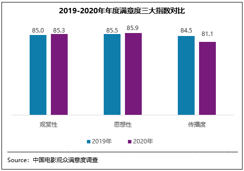 受疫情影响,2020年仅对下半年的暑期档(7月20日之后)、国庆档、初冬档及贺岁档进行了观众满意度调查。半年度观赏性、思想性得分分别为85.3分、85.9分,较去年同期提升了0.3分、0.4分。受大环境影响,观众分享传播热情相对下降,传播度下降3.4分至81.1分,但仍处于“满意”区间(≥80分)。