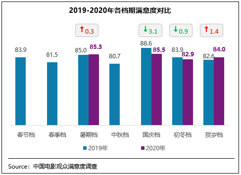 从档期来看,虽然2020各档期均不是全年最好成绩,但四个档期满意度均超82分,总体位居高位。其中,除初冬档之外的三个档期悉数进入历史调查37个档期的满意度TOP10,国庆档和暑期档分别以85.5分、85.3分居历史调查第3、第4位,贺岁档排名第6位。在全球疫情阴霾笼罩、电影票房同比大幅下滑的形势下,中国电影观众满意度保持相对高位实属不易。