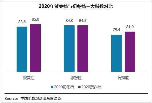 从2020年贺岁档满意度三大指数来看,档期观赏性、思想性和传播度指数分别为85.0分、84.3分和81.0分,均较初冬档有所提升,其中传播度增长1.6分,为三大指数中最高,表明档期整体传播氛围和比较冷清的11月相比有了一定改善,但与2019年贺岁档相比还有差距。