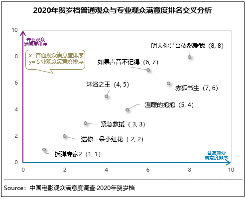 从细分维度上看,普通观众(共10项细分指标)和专业观众(共12项细分指标)评价也明显较为集中,《拆弹专家2》和《送你一朵小红花》包揽了不同层次观众共22项评价指标中21项的第一名。