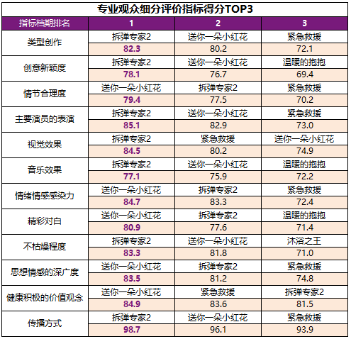 另外,在普通观众评价中,《沐浴之王》的故事喜爱度、主要演员的表演,《紧急救援》的视觉效果、正能量,《温暖的抱抱》的精彩对白得分进入了档期前三位。在专业观众评价中,《紧急救援》的视觉效果、演员表演、思想情感深广度等指标,《温暖的抱抱》的创意新颖度、精彩对白等,得到了相对较高的满意度评价。