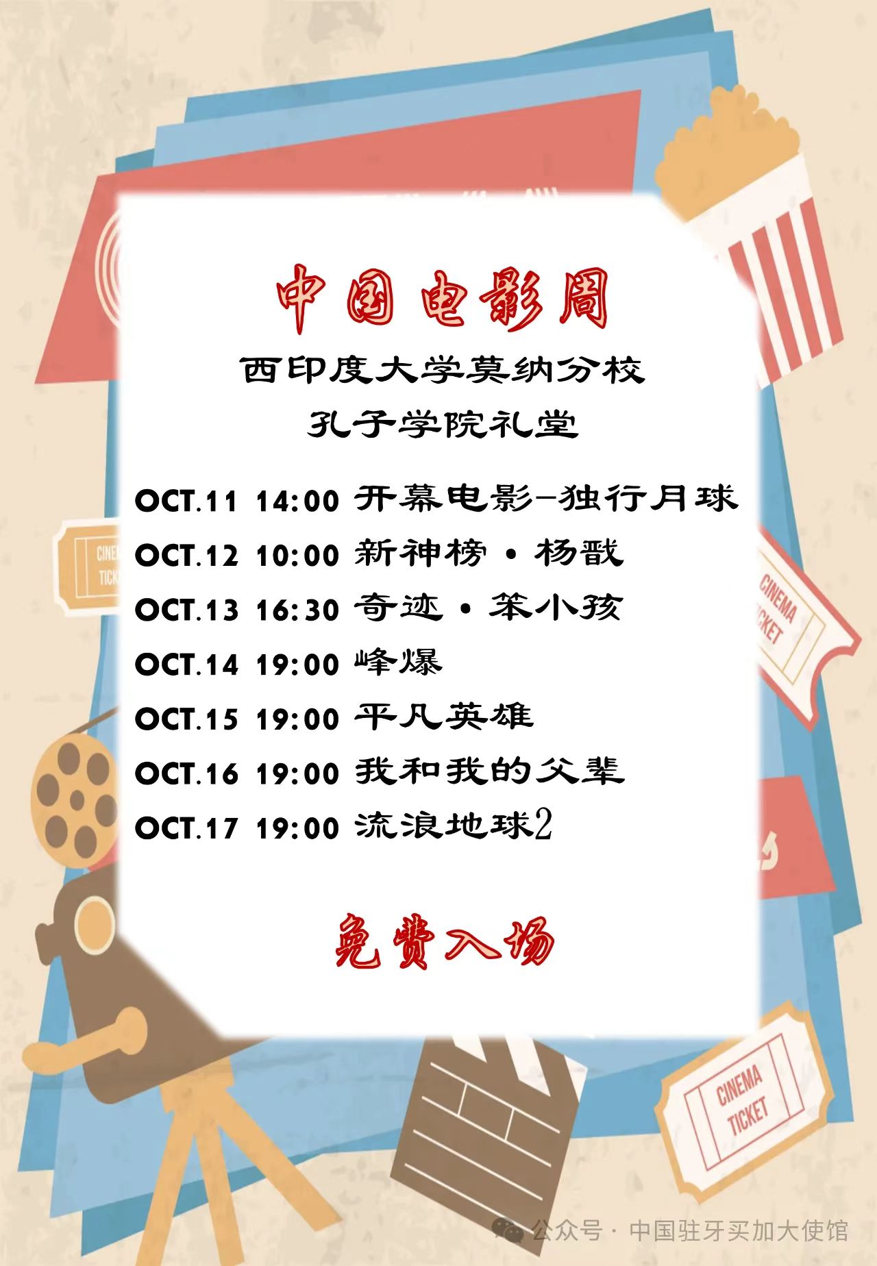 本届电影周为期七天,展映《独行月球》《我和我的父辈》《峰爆》《新神榜:杨戬》《奇迹·笨小孩》《平凡英雄》《流浪地球2》等七部票房和口碑双赢的国产影片。该活动得到中国国家电影局、中国电影资料馆和西印度大学莫纳分校孔子学院大力支持。