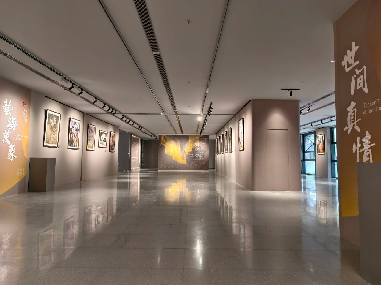本次展览迎来观展体验的全面革新,一层展厅将“东方神韵”“粉墨映画”“世间真情”“艺海万象”四大主题板块集中呈现,更值得关注的是,此次展览打破内外布局限制,将观展空间延伸至展厅之外,通透的玻璃窗成为展示载体,巧妙连通场馆内外,形成自然的视觉衔接。行人从展厅外即可窥见经典海报的风采,实现“内外共赏”的全新观展场景。