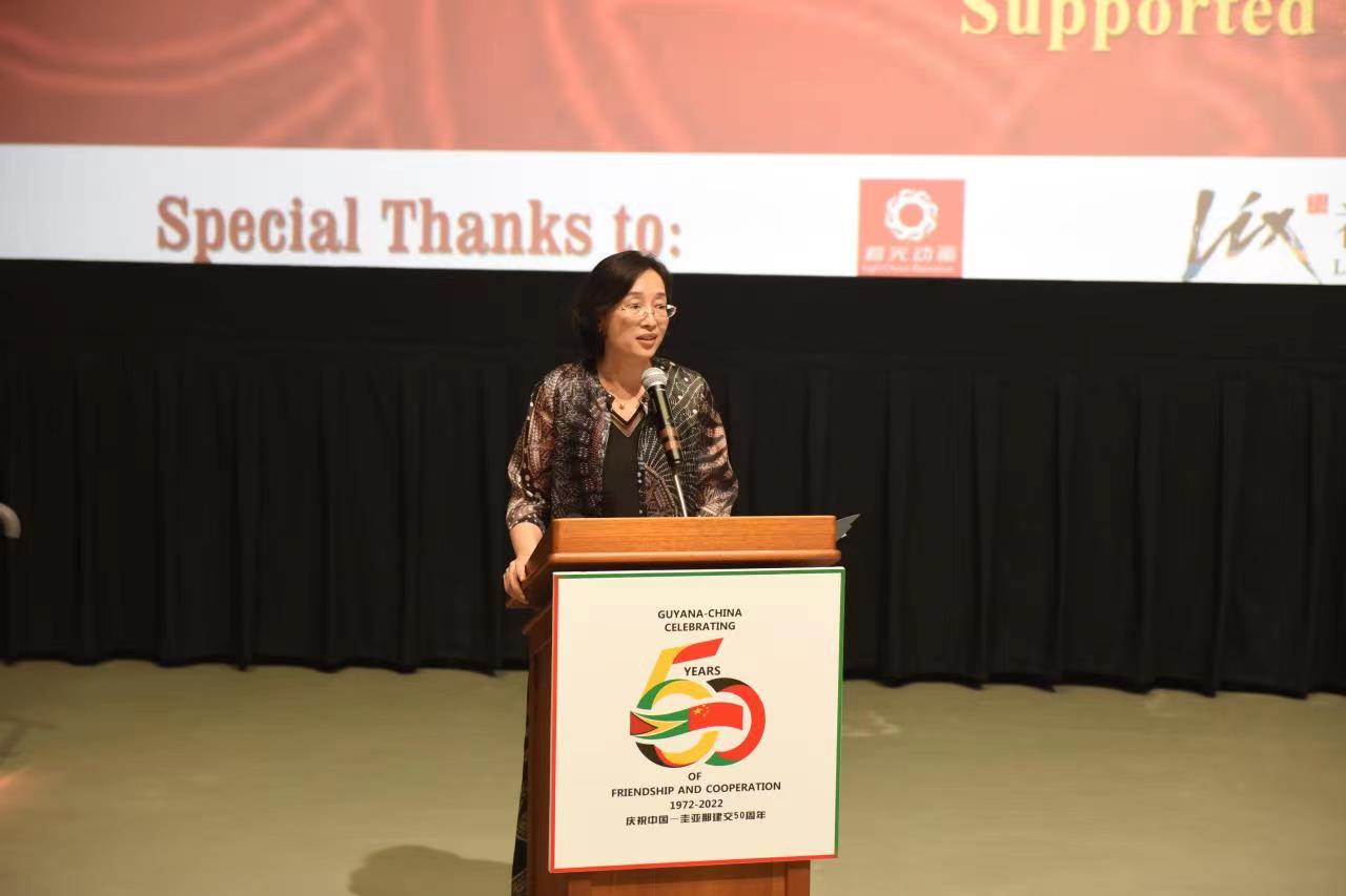 中国驻圭亚那大使郭海燕在致辞中表示,建交50周年是中圭关系重要里程碑。人文交流是两国关系的重要内容,两国人民是中圭友谊的建设者和受益者。相信这次“中国电影节”将进一步加深两国人民的相互了解和认同。中方愿继续同圭方开展丰富多彩的文化体育交流活动,让中圭友谊代代相传。