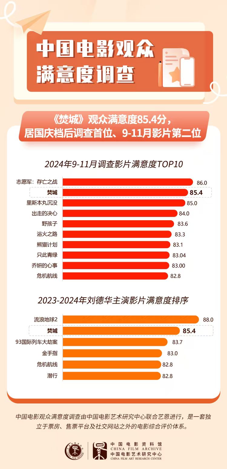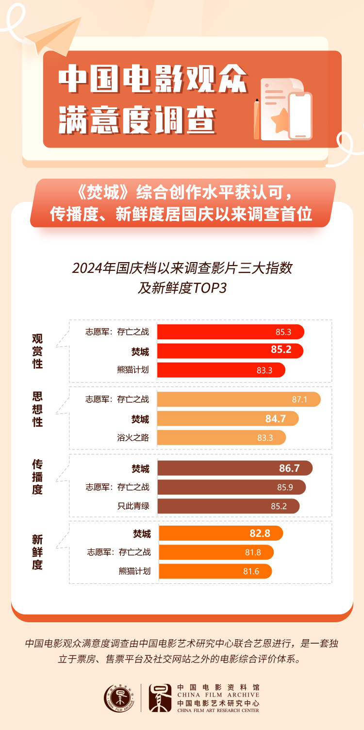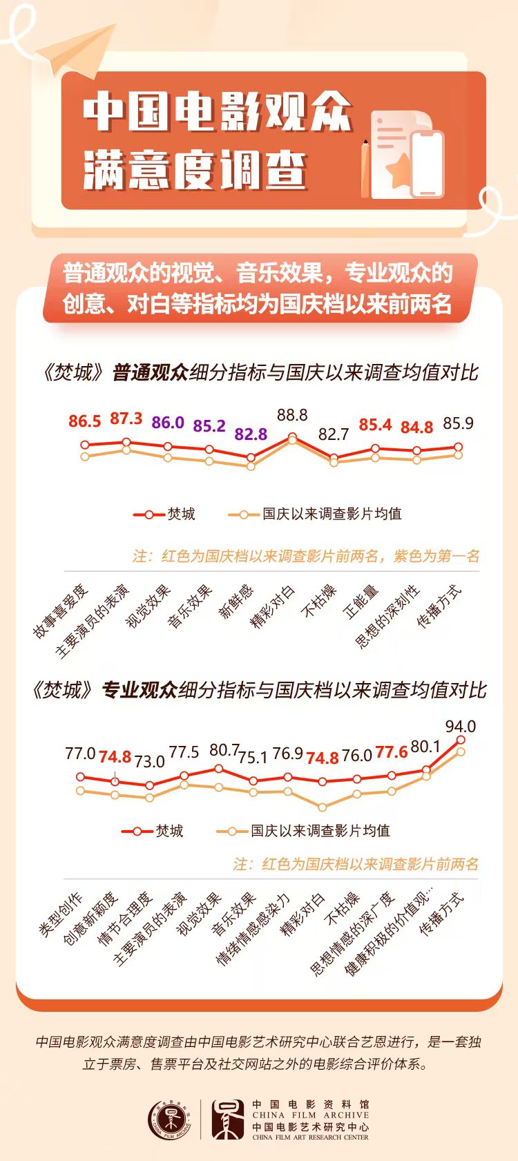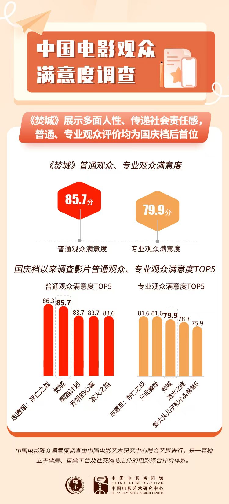 潘耀明执导新片《焚城》获得85.4分的观众满意度评价,为国庆档以后调查影片首位,题材新鲜感、港式高燃画风以及对复杂人性和社会现实的深刻呈现均获好评,市场热议不断,影片三大指数和新鲜度均居国庆以来调查影片前两位。 此外,10月底上映的《鸳鸯楼·惊魂》满意度80.0分,为满意度历史调查以来首部进入“满意”区间的国产惊悚片;辐射调查的进口动画《蓦然回首》创作获好评,专业观众满意度78.6分,高出同期辐射调查的《毒液:最后一舞》4.7分。