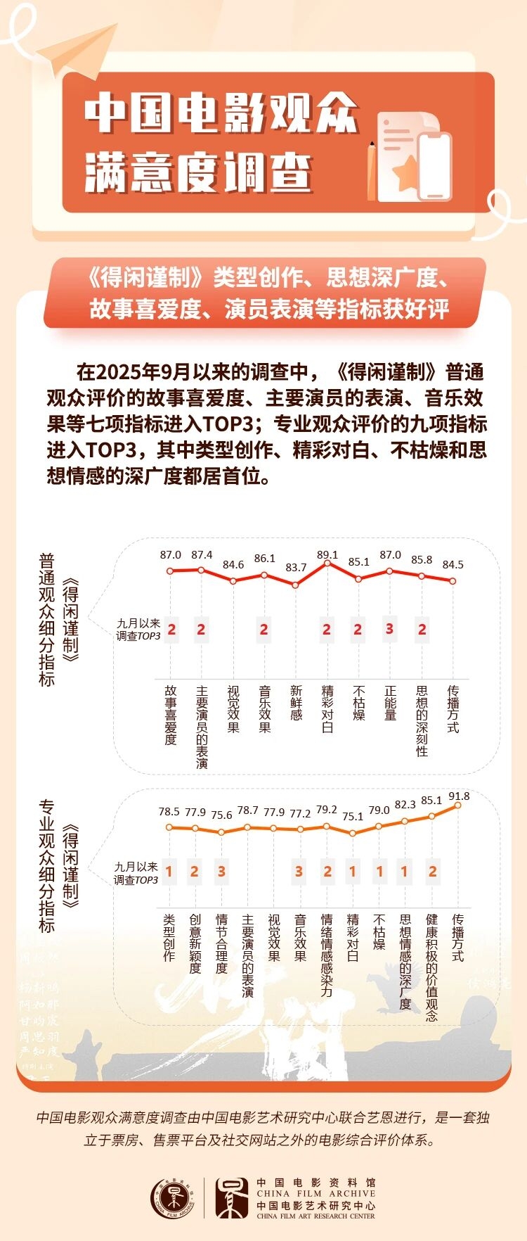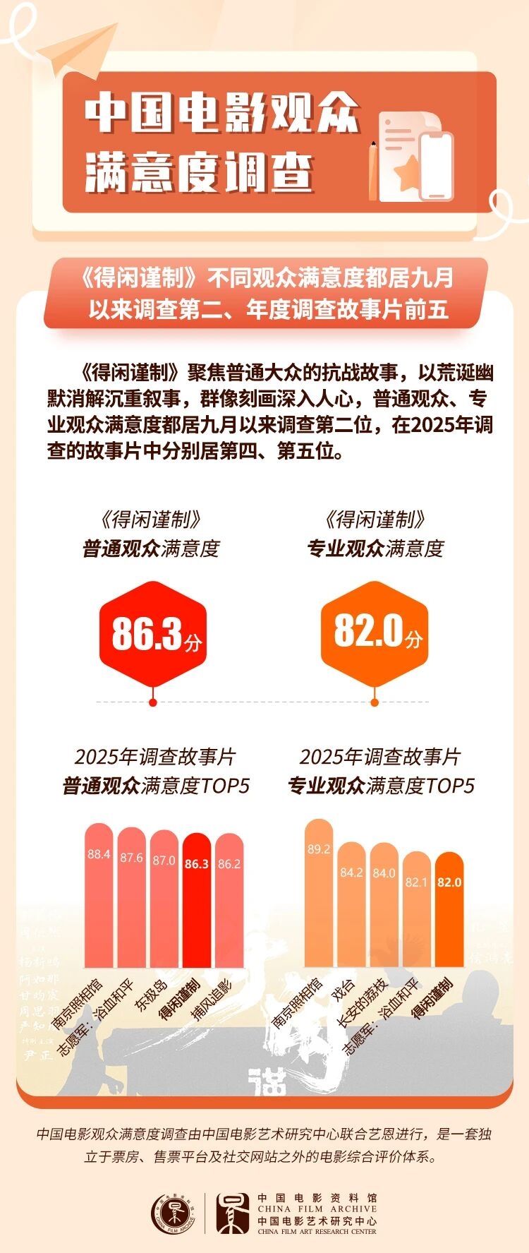 用荒诞现实主义手法讲述平民大众抗战故事的影片《得闲谨制》整体创作质量上乘,观众满意度86分,是2025年第四部满意度达86分的历史战争影片,在九月以来调查的影片中排位第二。