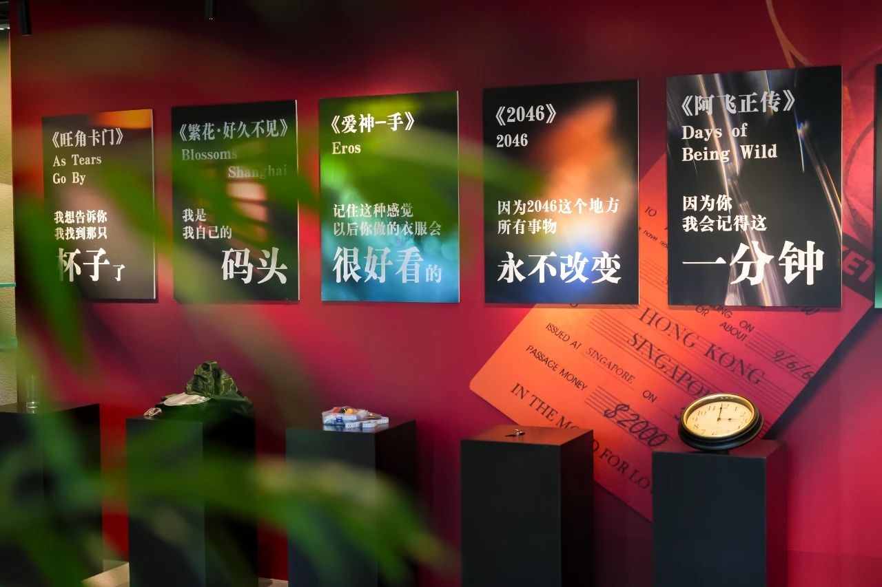 江南分馆三楼特别打造主题展陈空间,以本次特展的6部经典作品为灵感设计了四大区域:巨幅角色翻转墙、半透纱幔剧照、“排骨年糕店”场景还原以及经典道具陈列搭配动人台词,瞬间将观众带入王家卫导演充满质感与情调的光影世界。