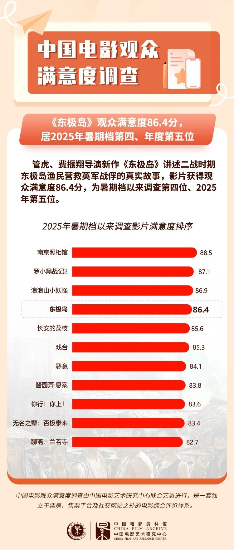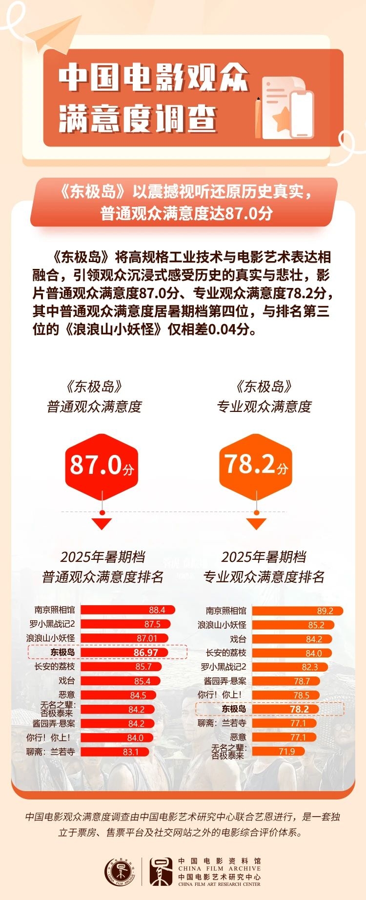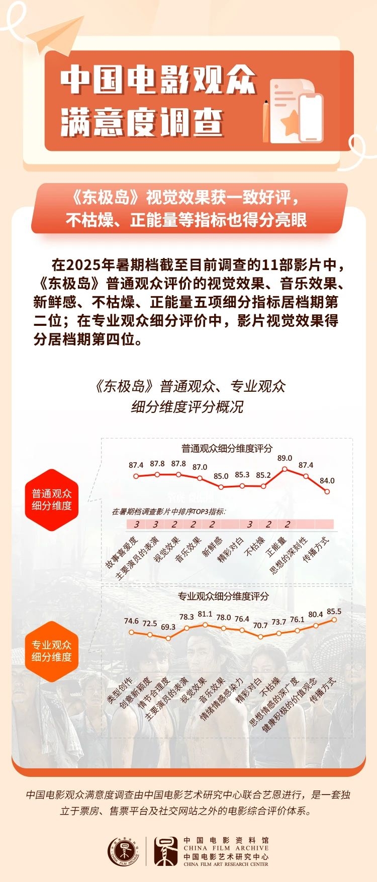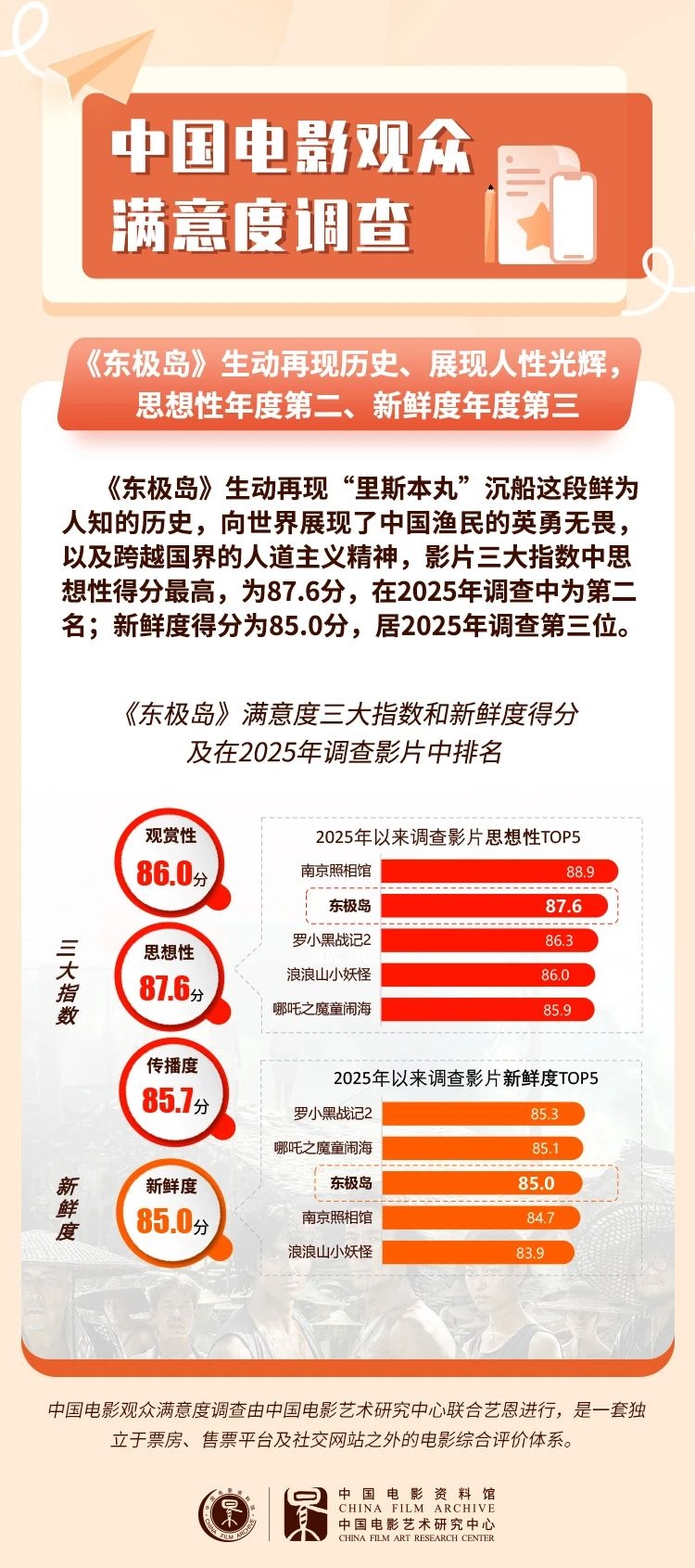 《东极岛》将高规格工业技术与电影艺术表达相融合,生动再现“里斯本丸”沉船这段鲜为人知的历史,向世界展现了中国渔民跨越国界的人道主义精神。影片获得观众满意度86.4分,居2025年暑期档第四、年度第五位;思想性得分87.6分,在2025年调查中为第二名。细分创作指标中,影片视觉效果获得不同类型观众的一致认可,新鲜感、正能量等指标也得分亮眼。