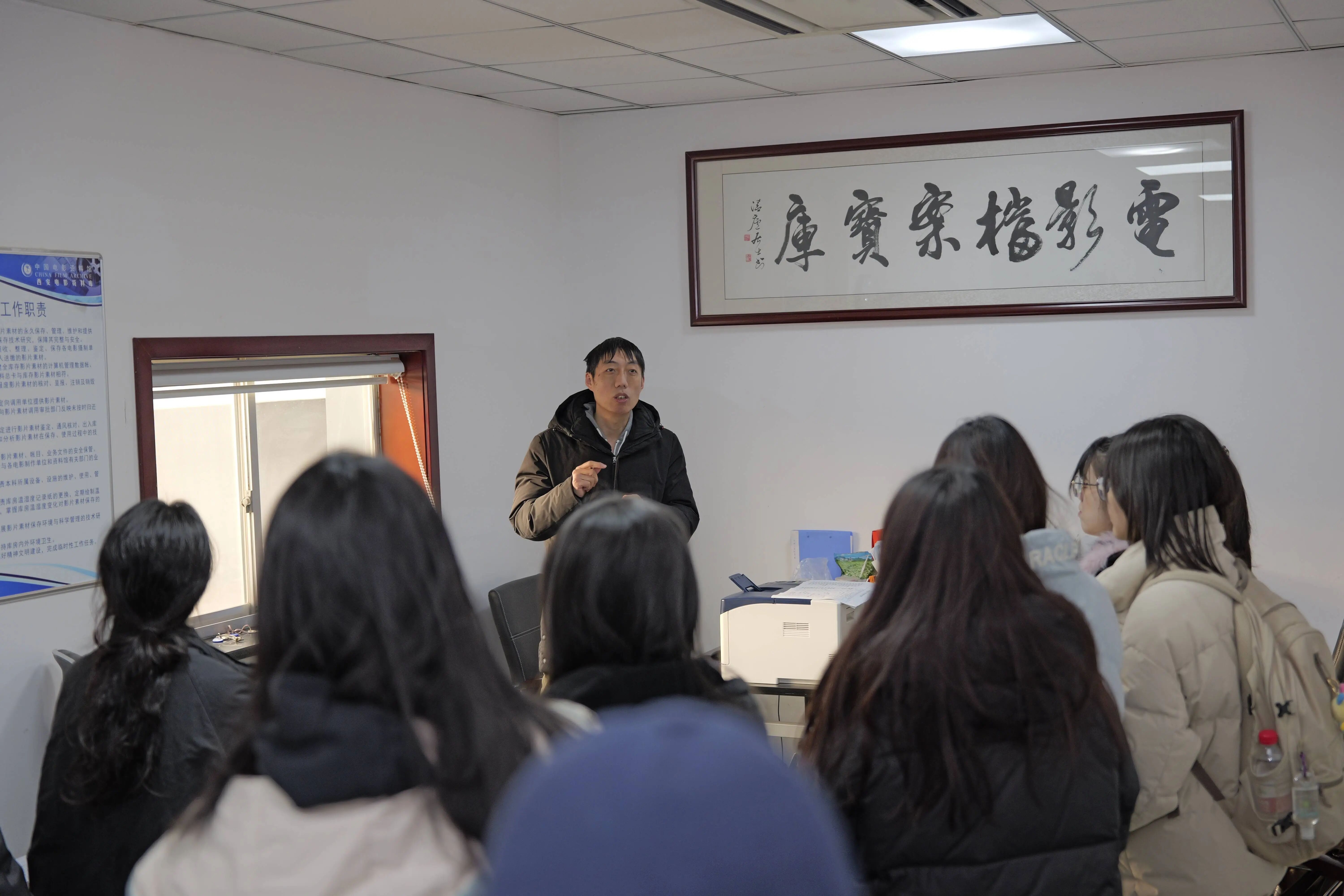 西安电影资料库副主任王军亮以及办公室王飞鹏、业务科王浚淦、复制科田奕三位科长对同学们的到来表示欢迎。在西安库,同学们了解了我国胶片资料保存的历史沿革、库房管理标准与胶片保存现状、影片分类的基础知识与检片要点,并在老师的指导下进行检片实操训练。
