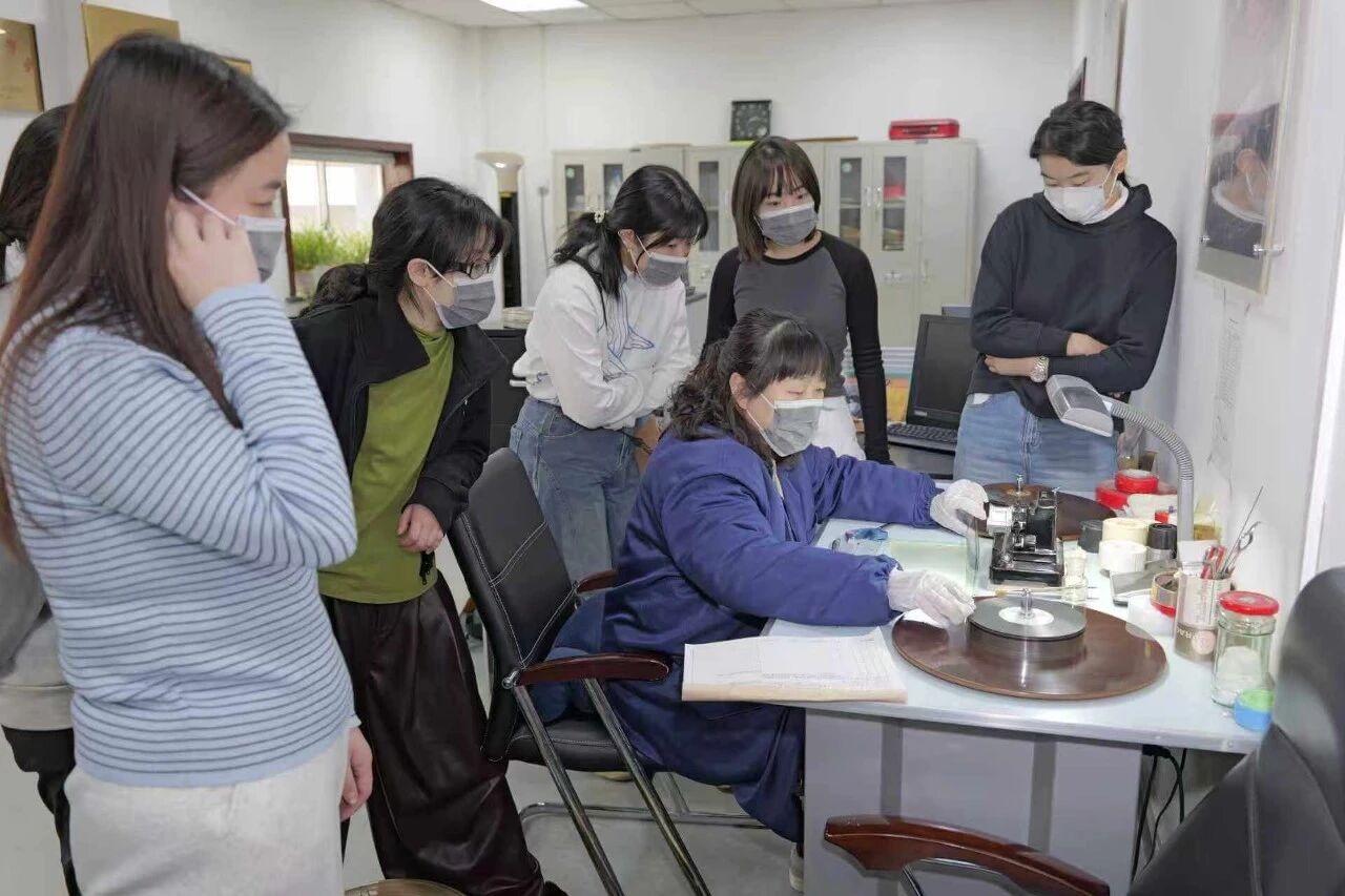 在修复车间,同学们亲身上手,体验醋酸片和涤纶片的修补与接片等物理修复技术。在洗印车间,同学们系统学习胶片洗印的设备与洗印流程,并在工作人员的指导下对经典影片《庐山恋》的小底进行配光。通过实操学习,同学们切身感受到西安电影资料库工作人员对胶片资料的珍视,体悟到“精心修复,影像长存”这一理念背后的责任与意义。
