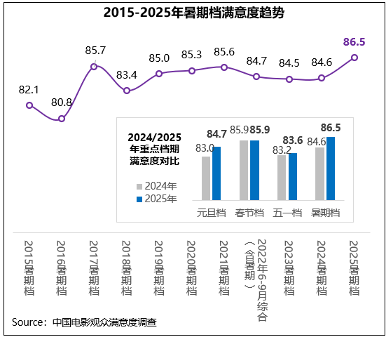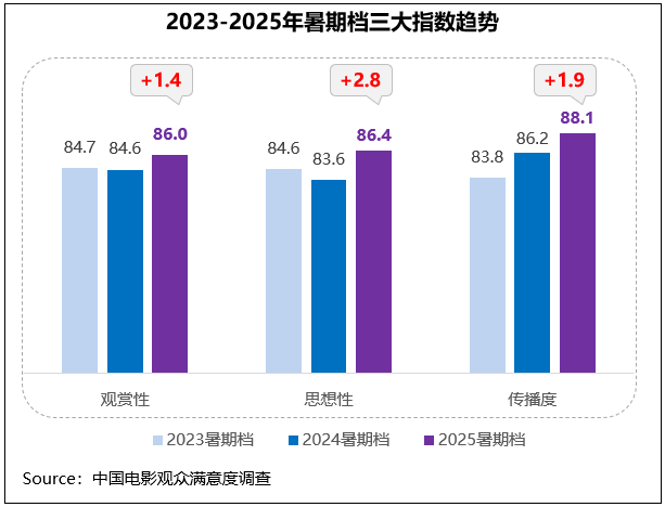 2025年暑期档影片整体创作质量上乘,获得观众高度认可,观赏性得分86.0分、思想性得分86.4分、传播度得分88.1分,分别同比增长了1.4分、2.8分、1.9分;档期三大指数都进入历史调查同期的前三位,是唯一一个三大指数都超过86分的暑期档。