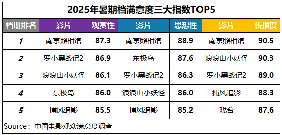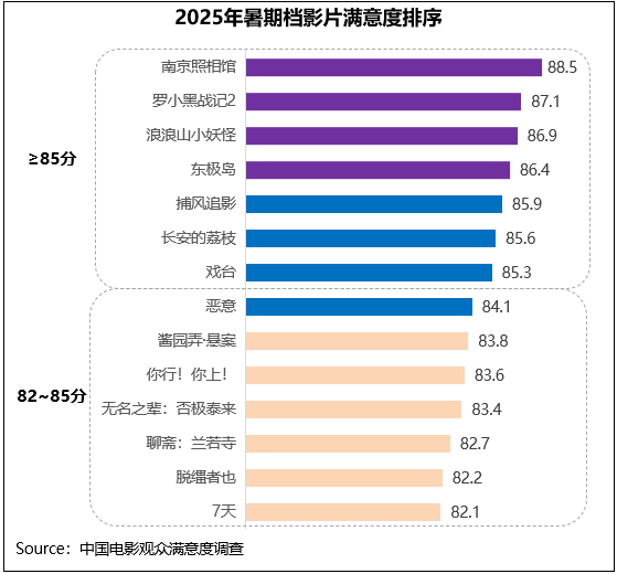 中国电影观众满意度调查・2025年暑期档调查结果显示,暑期档电影观众满意度得分86.5分,同比提升1.9分。档期调查的重点影片满意度都超过82分,《南京照相馆》《罗小黑战记2》《浪浪山小妖怪》《东极岛》《捕风追影》《长安的荔枝》《戏台》共7部影片满意度超85分,数量为调查各档期之最。2025年暑期档以高质量内容矩阵构建多元化精品高地,口碑效应带动市场不断升温。