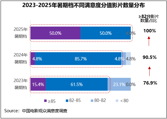 2025年暑期档高满意度作品齐聚,调查的14部影片满意度都超过82分,其中半数影片(共7部)超85分,2023年暑期档为2部、2024年暑期档1部,这个数量也是历史调查各档期之最。