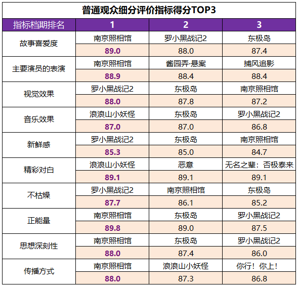 从细分维度上看,在普通观众评价体系中,《南京照相馆》的故事喜爱度、主要演员的表演、正能量、思想深刻性和传播方式共5项指标为档期最高,《罗小黑战记2》的视觉效果、新鲜感、不枯燥,以及《浪浪山小妖怪》的音乐效果都居档期第一位。此外,《酱园弄・悬案》《捕风追影》的主要演员的表演、《东极岛》的故事喜爱度、《恶意》的精彩对白等指标都居档期前三位。