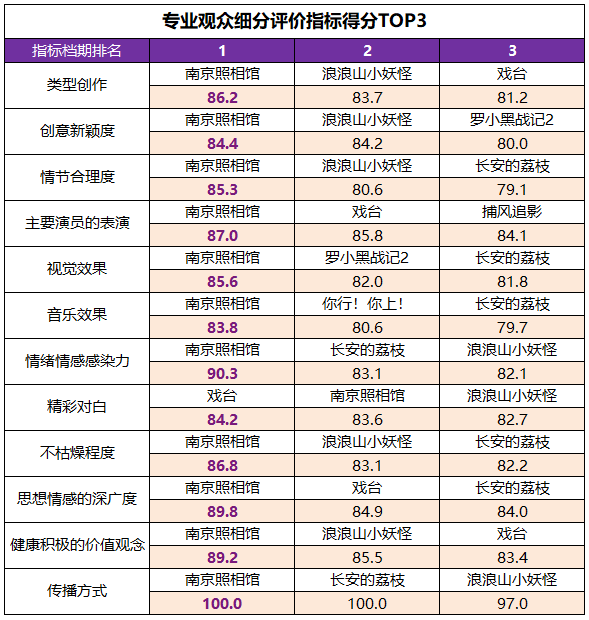在专业观众评价体系中,《南京照相馆》在12项指标中有11项居档期首位,主要演员的表演、思想情感的深广度、健康积极的价值观念等指标得分亮眼;《戏台》的精彩对白得分为档期最高。此外,《浪浪山小妖怪》的创意新颖度、《罗小黑战记2》的视觉效果、《你行!你上!》的音乐效果、《长安的荔枝》情绪情感感染力、《捕风追影》的主要演员的表演等指标都居档期前三位。