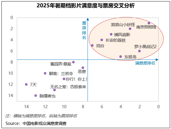 综合调研及票房数据显示,暑期档调查的14部影片中,《南京照相馆》《罗小黑战记2》《浪浪山小妖怪》《捕风追影》《长安的荔枝》《戏台》《东极岛》这7部影片(下图中第一象限)单片满意度都超85分,档期调查影片满意度前7位和票房前7位重合。