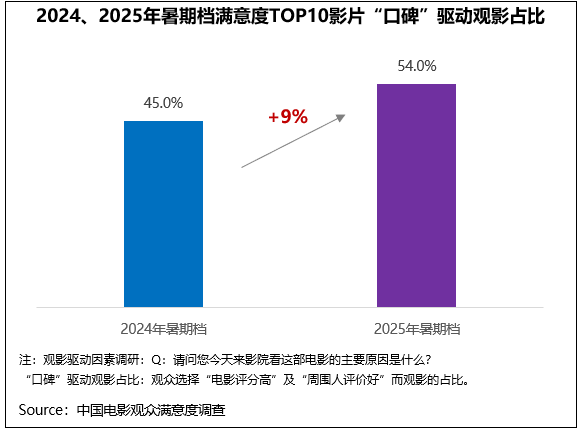 满意度调查对观众到影院观看某部影片的主要动因也进行了综合分析,2025年暑期档满意度TOP10影片的该项数据显示,因为电影口碑好(观影动因选择“电影评分高”及“周围人评价好”)而前来观影的占比达54.0%,比2024年暑期档满意度TOP10影片高出9%;其中《南京照相馆》这一占比高达62%。