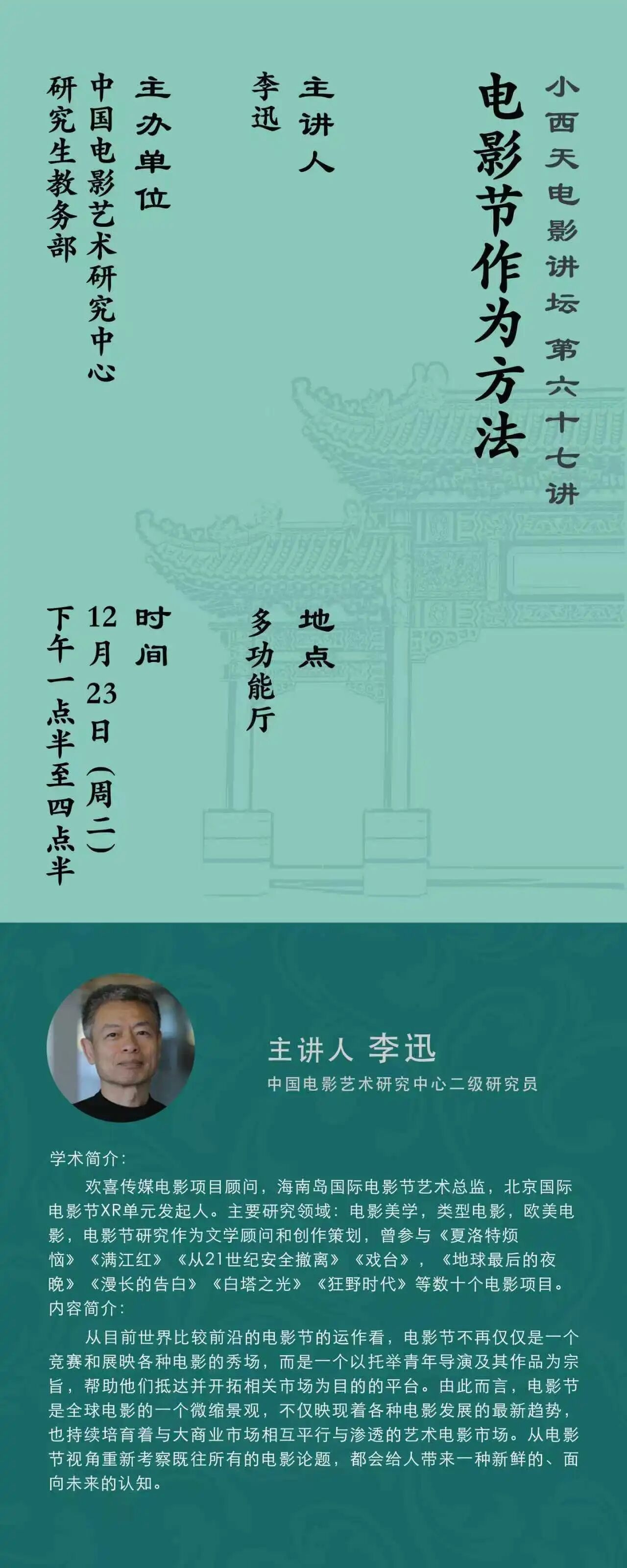 2025年12月23日下午,由中国电影艺术研究中心研究生教务部主办的“小西天电影讲坛”第六十七讲在我中心多功能厅成功举行。本次讲座特邀李迅研究员主讲,他以《电影节作为方法》为题,为中心研究生带来一场视野开阔、内容丰富的学术分享。