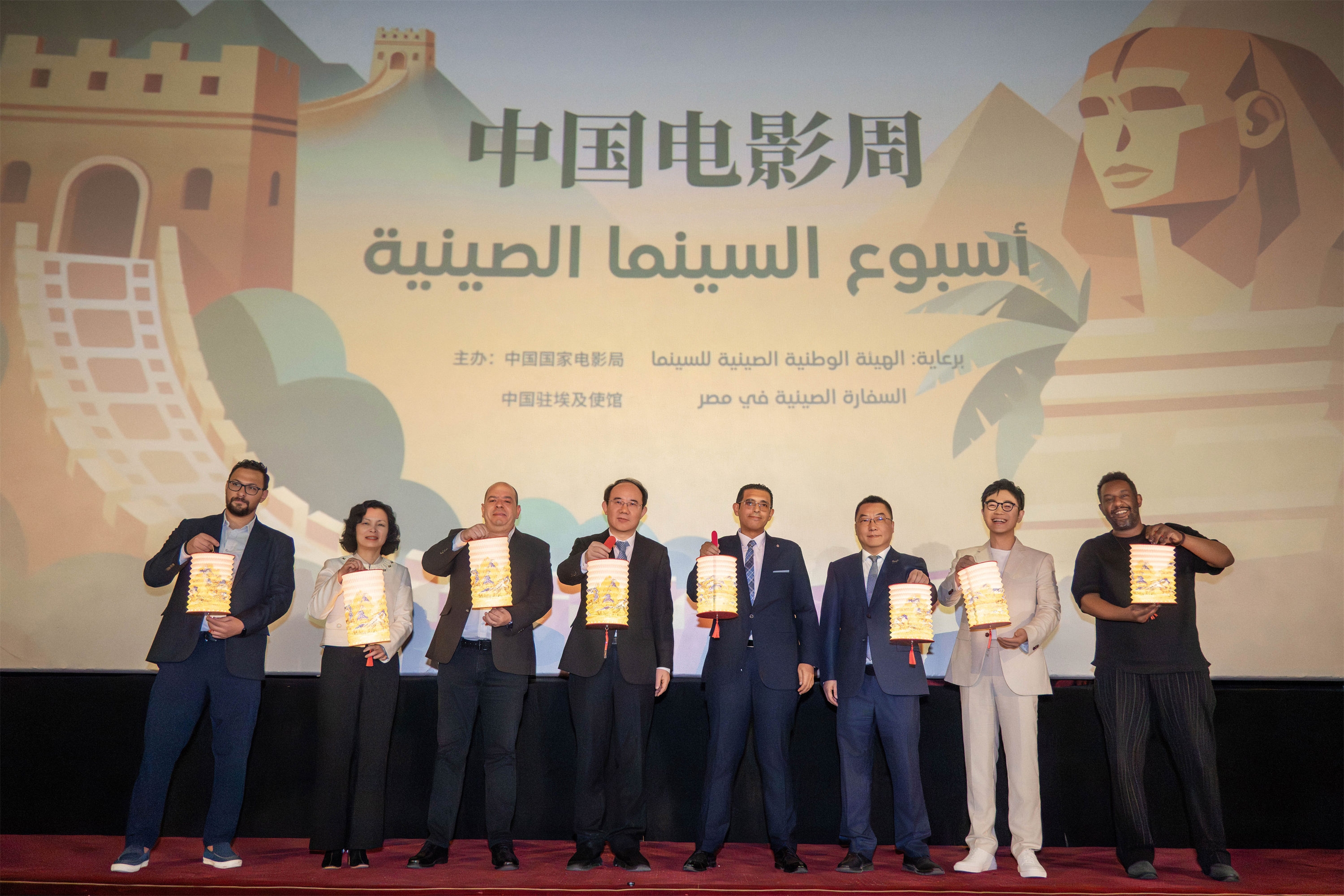 中国国家电影局常务副局长毛羽,埃及国家电影中心主任艾哈迈德·萨利赫,中国电影资料馆负责人张旭霞,中国驻埃及大使馆文化参赞、开罗中国文化中心主任张易,以及《长安的荔枝》导演兼主演大鹏等嘉宾拉开手中的中式灯笼,共同为活动启幕。