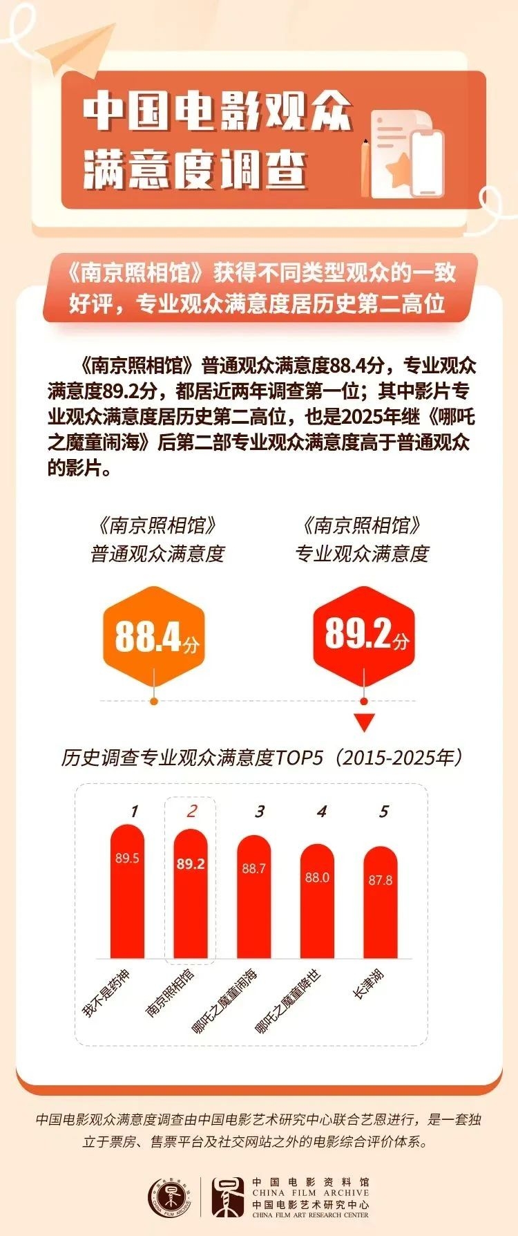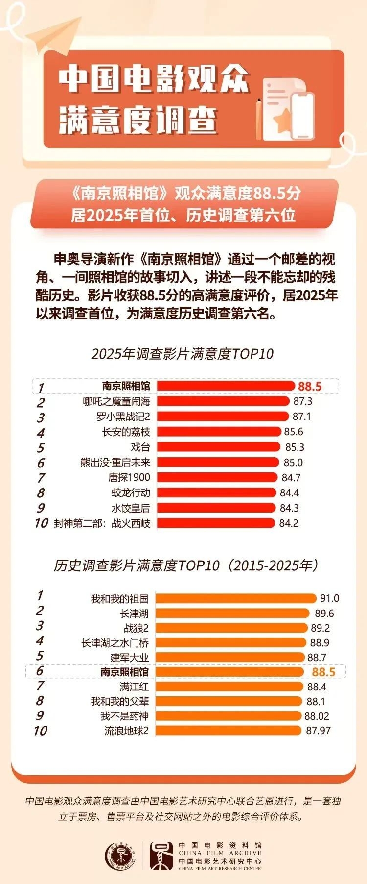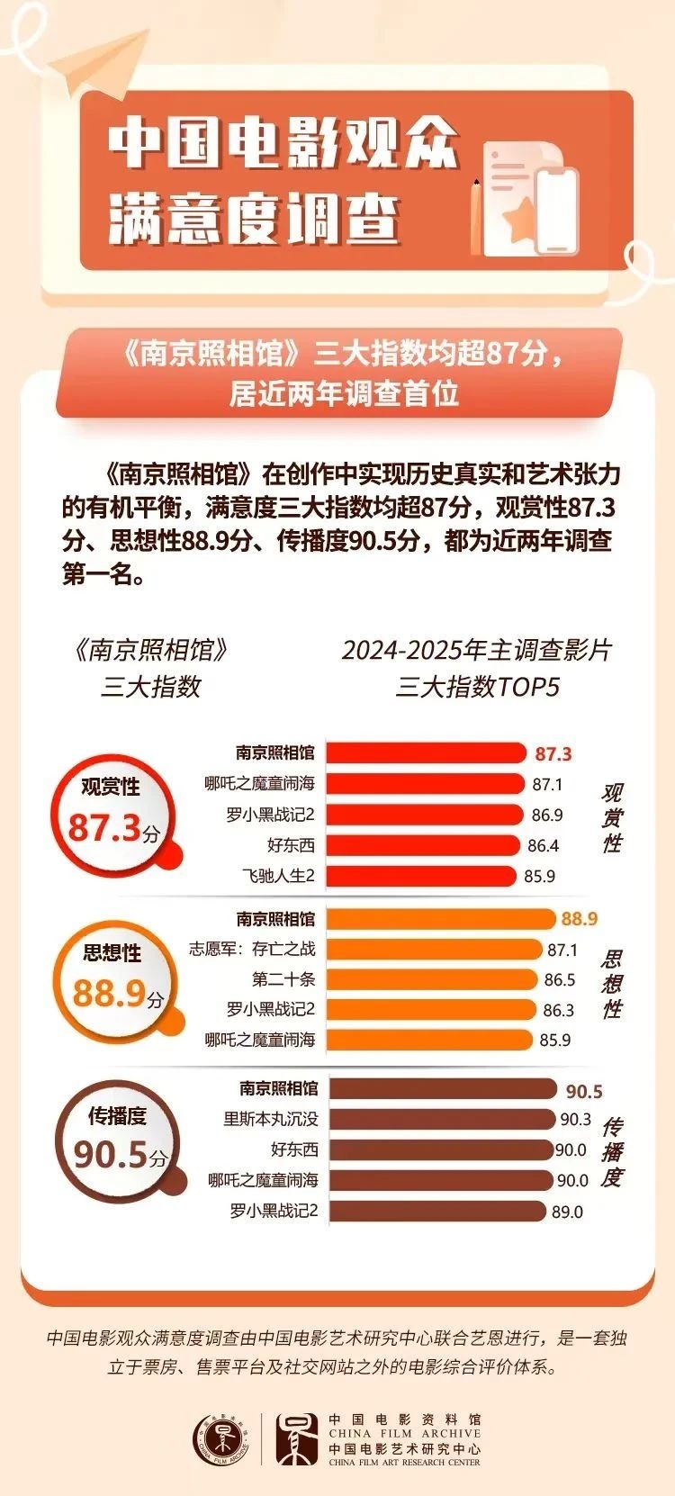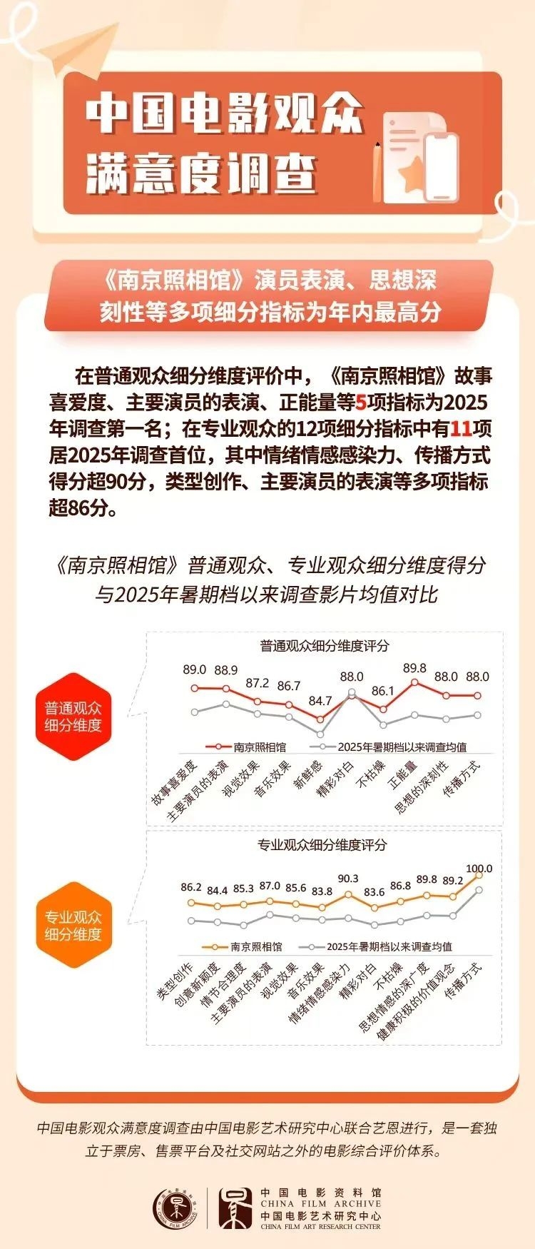 申奥导演新作《南京照相馆》通过一个邮差的视角、一间照相馆的故事切入讲述一段不能忘却的残酷历史。影片通过独特影像语言和克制艺术表达唤醒民族记忆,获得观众满意度88.5分,为2025年截至目前调查最高分,居历史第六位。影片普通观众、专业观众满意度都为近两年最高分,其中专业观众满意度居历史调查第二高位。